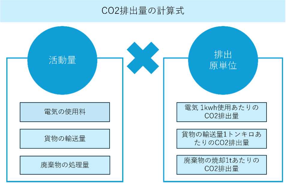 具体的に排出原単位では、1kWhの電力を発電した際に排出されたCO₂排出量、1kmの輸送距離の移動で排出されたCO₂排出量、重量1tあたりを生産する際に発生するCO₂排出量、といった単位当たりのCO₂排出量が用いられています。